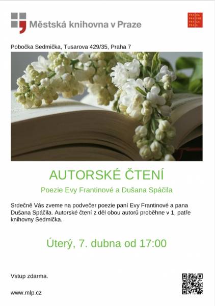 Zveme Vás na autorské čtení Evy Frantinové a Dušana Spáčila. Budou číst 7. dubna v 17 hodin ze své minulé i nejnovější tvorby. Místo - Městská lidová knihovna, Tusarova uliuce, Praha 7. Vstup volný.
